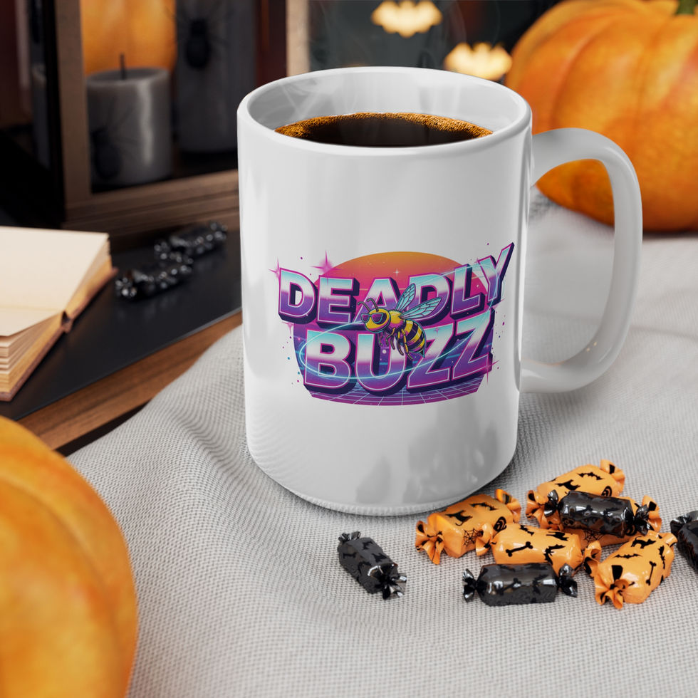 A glossy ceramic mug that brings neon-retro energy to your morning ritual. Bold, saturated printing wraps a stylized "Deadly Buzz" logo — complete with a neon sun and a striking hornet — around clean white ceramic. It feels bright in your hand and pops against plain countertops. Use it at your desk to cue focus, on late-night creative sessions, or as the signature piece on a themed shelf. The C-shaped handle sits comfortably for single-handed sips, while the sturdy ORCA coating keeps the graphic vibrant through everyday use.