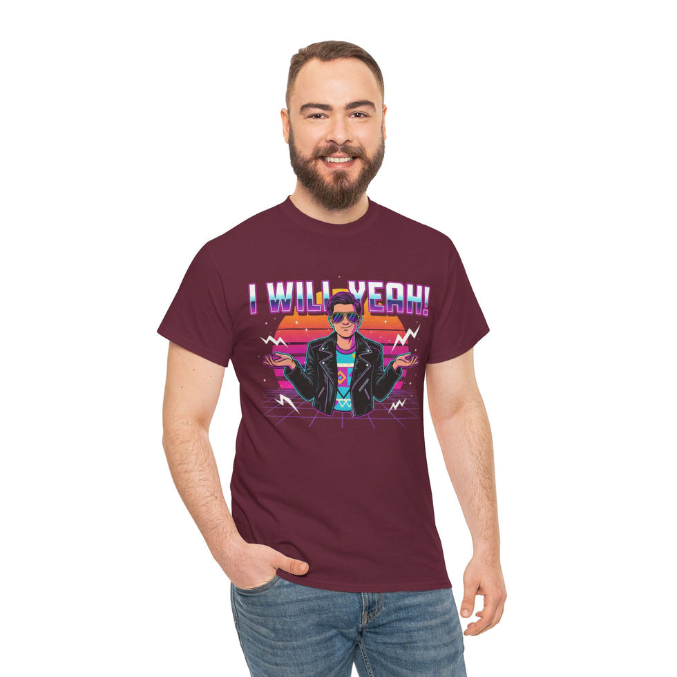 This classic cotton tee carries full 80s retro energy — neon gradients, a cool leather-jacket pose, and the confident slogan “I WILL YEAH!” across the chest. Lightweight but durable, the shirt feels soft against the skin and keeps its shape through washes. Wear it when you want to channel vintage arcade nights, synthwave drives, or just a playful blast-from-the-past look. It sits comfortably in everyday rotation: layered under a denim jacket, thrown on for concerts, or worn with high-waisted jeans to lean into the era’s vibe. The printed details are crisp and vivid, so the artwork reads bold and alive from across the room.